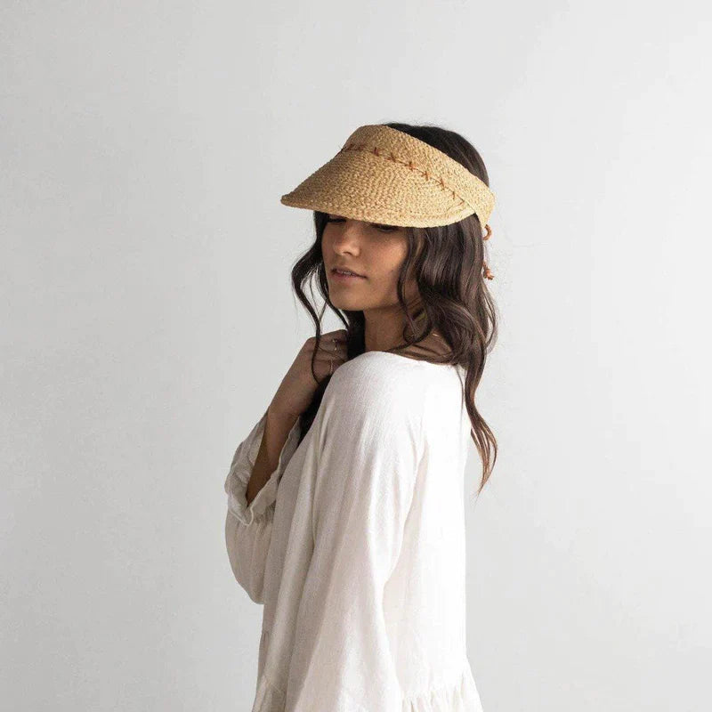 Pack this stylish and functional sun visor along for the poolside, hikes or any sunny day. Convenient leather tie in back will fit any head size.